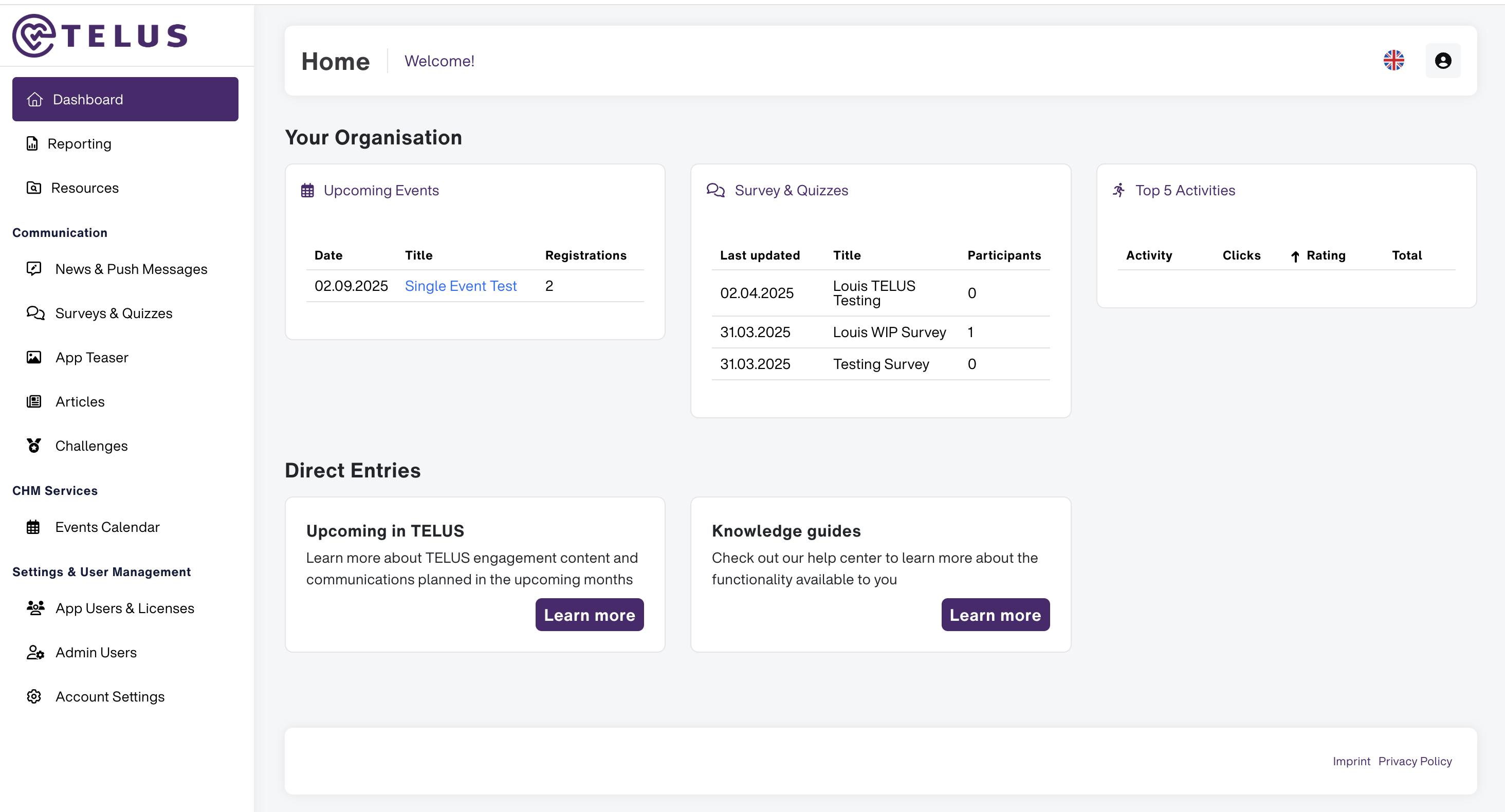 Wenn du schnell sehen willst, was gerade in euren Gesundheits‑ und Wellbeing‑Initiativen passiert, findest du alle Infos direkt im Dashboard – dem Startbildschirm im TELUS Health Engage Backoffice.