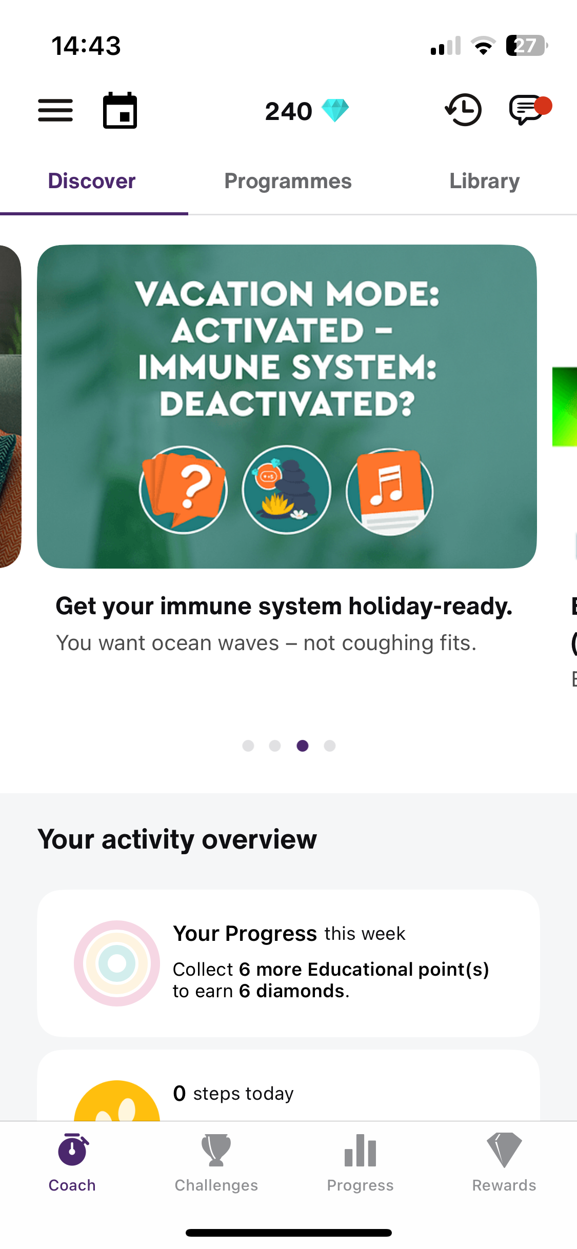 Die Reihenfolge der Teaser richtet sich nach dem Erstellungsdatum – der neueste Teaser erscheint immer oben im App Karussell. Neben euren firmenspezifischen Teasern werden dort auch globale Inhalte wie Challenges oder Missionen angezeigt, die für alle TELUS Health Engage App Nutzer sichtbar sind.