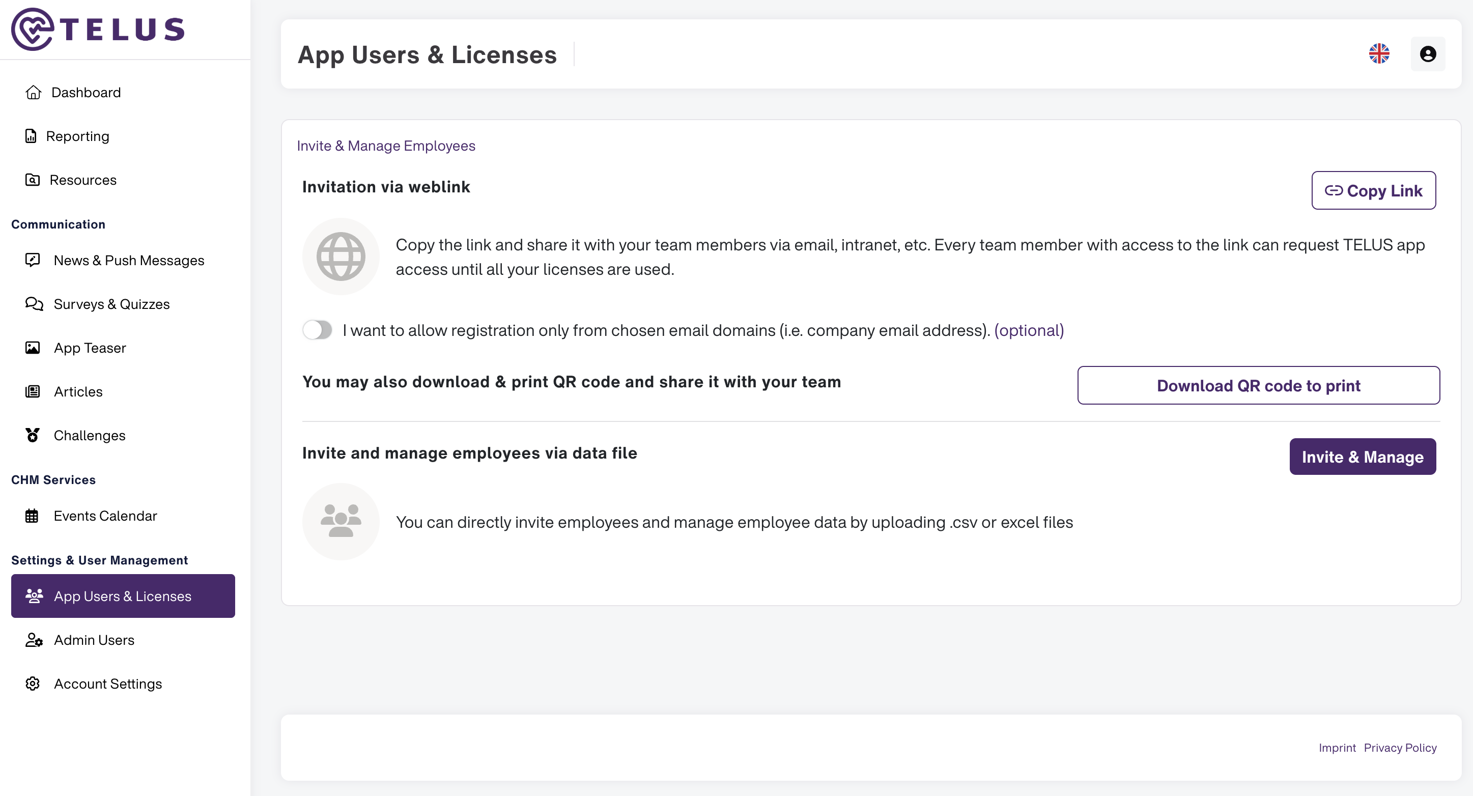 In diesem Bereich des TELUS Health Engage Backoffice kannst du deine Mitarbeitenden ganz einfach zur TELUS Health Engage App einladen – und den Zugriff aktiver oder ehemaliger Teammitglieder verwalten.